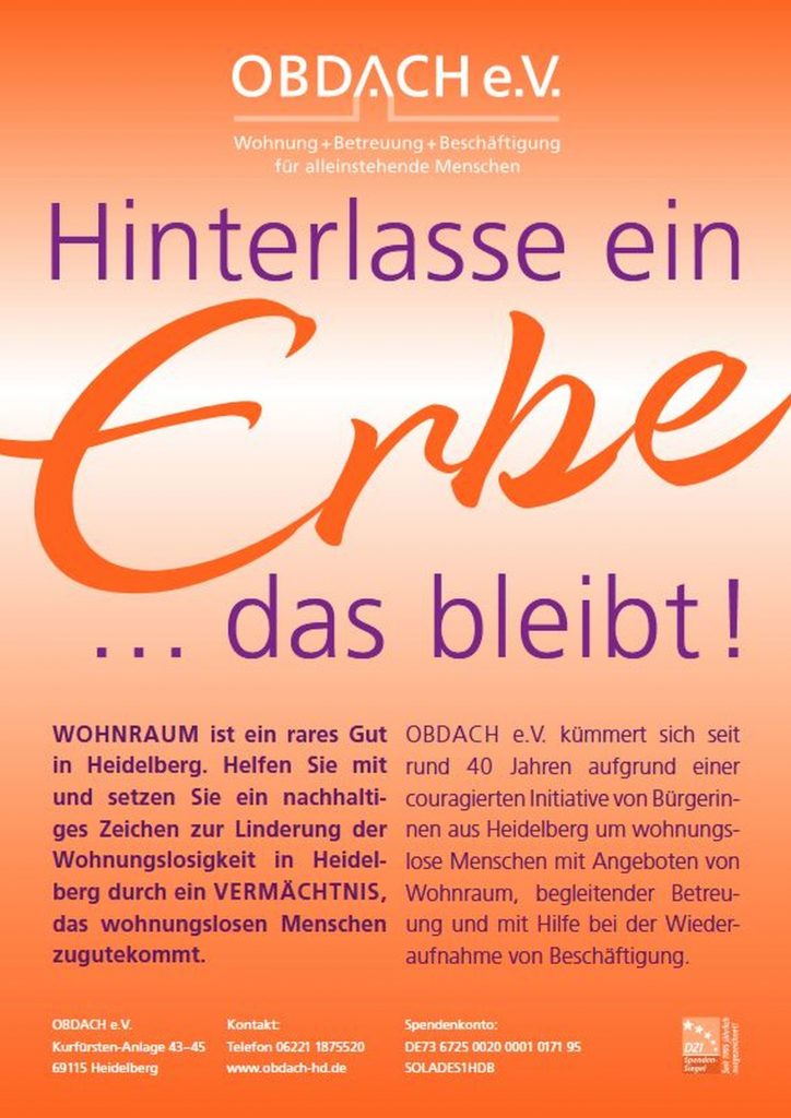 Viele Menschen wünschen sich, etwas zu hinterlassen, das über das eigene Leben hinaus wirkt. Mit einem Vermächtnis oder einer Erbschaft zugunsten von OBDACH e.V. Heidelberg können Sie genau das erreichen – und langfristig Gutes für die Region tun.